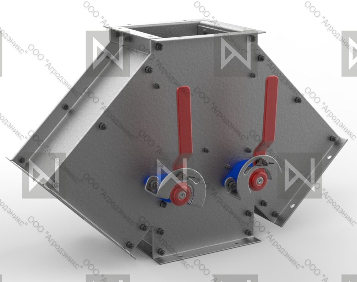 Клапан с электрическим/ручным приводом используется для перенаправления потока зерна из входного самотечного канала в один из двух ответвлений, путем перекрытия шибером не задействованного канала.